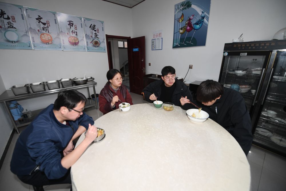 杨鑫博(左二)和同事在项目部食堂吃饭(2月15日摄)。新华社记者朱旭东 摄