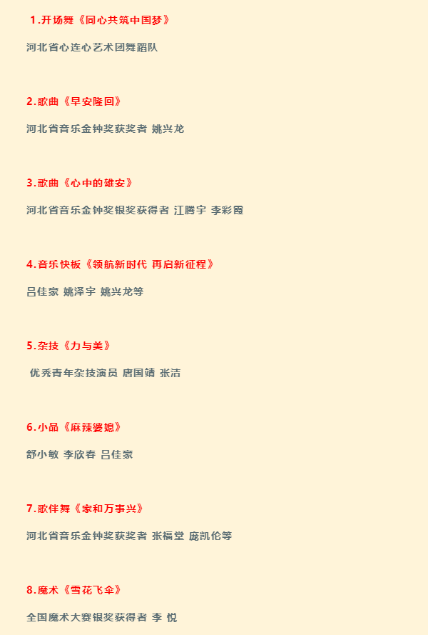 为深入学习宣传贯彻党的二十大精神,传递党的声音,助力新区建设,把文化送到基层百姓家门口,按照中共中央宣传部、中央文明办、文化和旅游部等关于开展“我们的中国梦—文化进万家”活动的通知精神,省“心连心”艺术团于2月17日开始,在容城开展为期6天(10场)的系列文化惠民巡回演出活动。