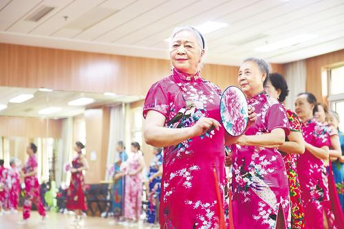 三河市燕达金色年华健康养护中心舞韵教室,模特队的老人们在认真排练。