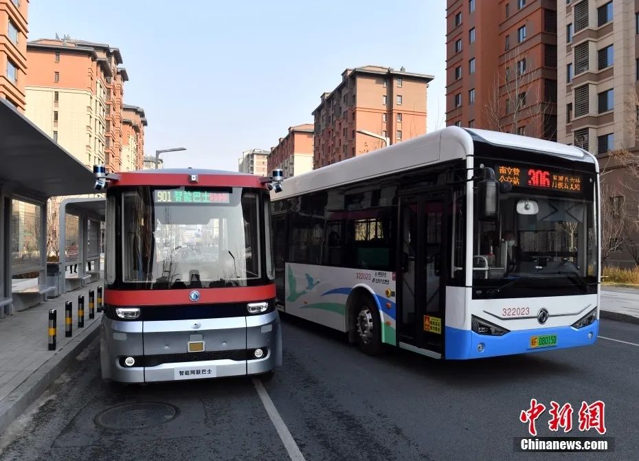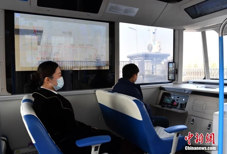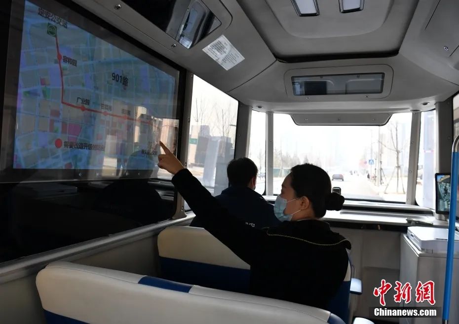 智能网联巴士901线测试车辆准备发车。中新社记者韩冰 摄