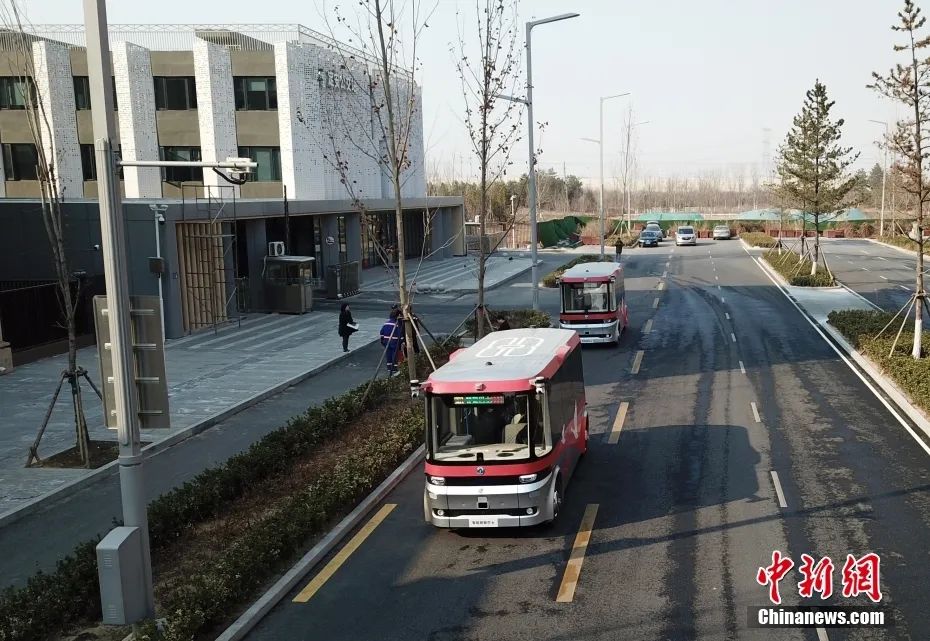 2月22日,智能网联巴士901线测试车辆与普通城市公交车驶出公交站台。雄安新区的智能网联巴士近期正在进行投入运营前的道路测试,该巴士配备了超高感度摄像头、超声波雷达、激光雷达、毫米波雷达等感知设备,组成了车辆的“眼睛”。