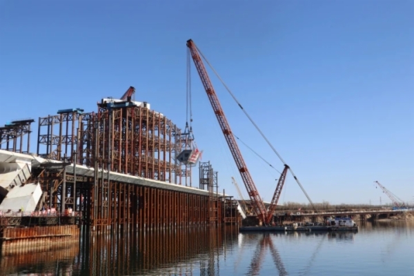 2月20日,随着吊装设备平稳运行,由中铁山桥承制的京雄高速公路永定河特大桥首段拱肋节段顺利吊装,标志着大桥正式进入拱肋节段安装阶段,并将向国内首个空间异形拱肋飞燕提篮式钢箱拱桥高精度合龙目标全力冲刺。