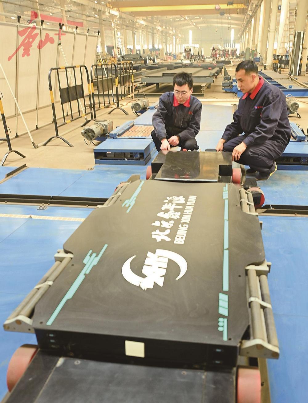 京能集团北京鑫华源智能停车公司的两位技术人员正在调试新型四向板运机器人。记者张北男、闫军 摄