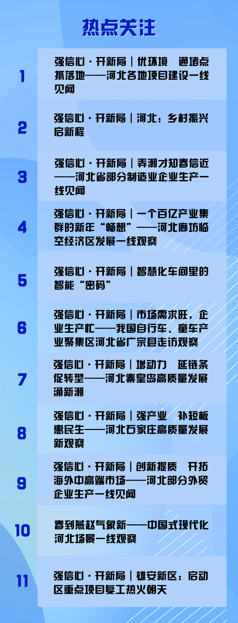 春意融融,正是生机勃发好时节,宜快马加鞭向未来。河北各地全力做好巩固拓展脱贫攻坚成果同乡村振兴有效衔接,让脱贫成效更可持续;一批制造业企业在政策帮扶下抢订单、拓市场;一批外贸企业铆足干劲、开足马力、创新提质;石家庄市加快打造千亿元产业集群;秦皇岛市高质量发展新潮涌动;雄安新区启动区奏响节后复工“奋进曲”;河北廊坊临空经济区项目建设如火如荼,招商引资同步跟进……一股股加足马力抢开局的热潮掀起,一个个中国式现代化河北场景呈现在人们眼前。二月份以来,新华社记者深入河北多地,用文字与影像记录下“强信心·开新局”的一线场景。