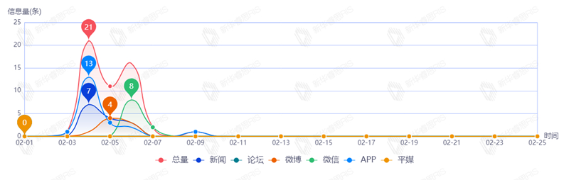截至2月25日,该文章在互联网上传播总量为52篇。其中2月4日是传播的高峰期,共传播21篇文章。各信源的信息发布情况中,APP信息占比最大,其次是新闻,信息量分别为20、14,占比分别为40.00%、28.00%。(数据来源:新华睿思数据云图分析平台)