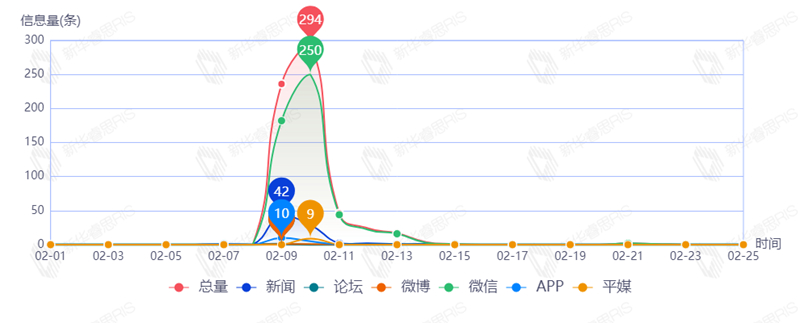 截至2月25日,该文章在互联网上传播总量为626篇。其中2月10日是传播的高峰期,共传播294篇文章。各信源的信息发布情况中,微信信息占比最大,其次是新闻和APP,信息量分别为470、77、16,占比分别为81.74%、13.39%、2.78%。(数据来源:新华睿思数据云图分析平台)
