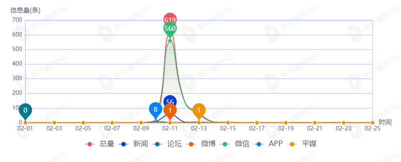 截至2月25日,该文章在互联网上传播总量为870篇。其中2月11日是传播的高峰期,共传播619篇文章。各信源的信息发布情况中,微信信息占比最大,其次是新闻和APP,信息量分别为706、76、12,占比分别为88.69%、9.55%、1.51%。(数据来源:新华睿思数据云图分析平台)