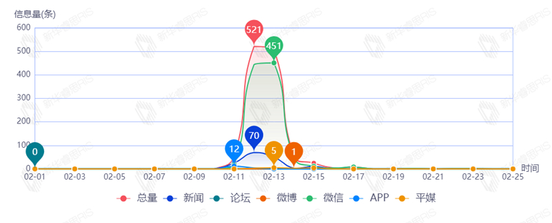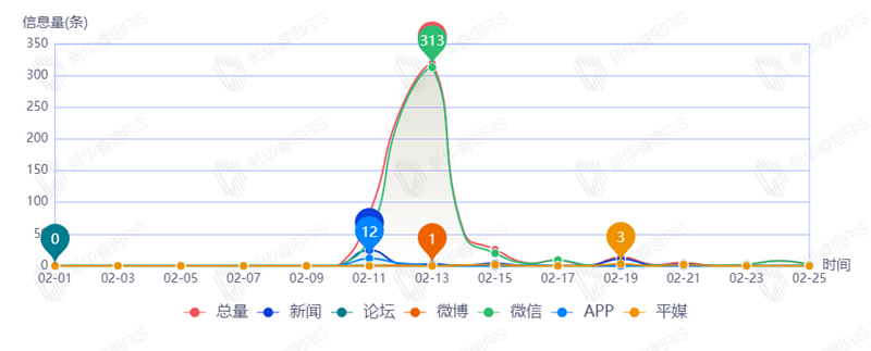 截至2月25日,该文章在互联网上传播总量为777篇。其中2月13日是传播的高峰期,共传播319篇文章。各信源的信息发布情况中,微信信息占比最大,其次是新闻和APP,信息量分别为645、50、19,占比分别为88.97%、6.90%、2.62%。(数据来源:新华睿思数据云图分析平台)