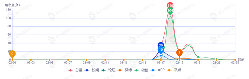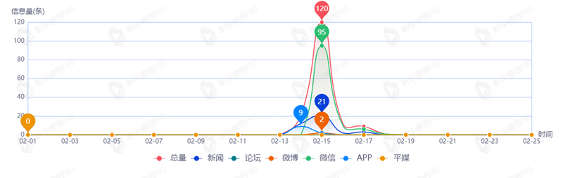 截至2月25日,该文章在互联网上传播总量为163篇。其中2月15日是传播的高峰期,共传播120篇文章。各信源的信息发布情况中,微信信息占比最大,其次是新闻和APP,信息量分别为112、38、11,占比分别为68.71%、23.31%、6.75%。(数据来源:新华睿思数据云图分析平台)