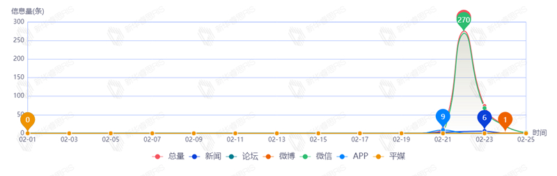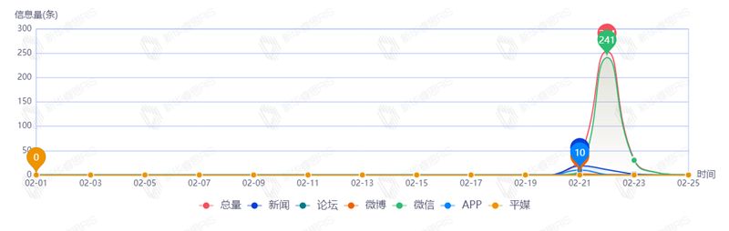 截至2月25日,该文章在互联网上传播总量为327篇。其中2月22日是传播的高峰期,共传播254篇文章。各信源的信息发布情况中,微信信息占比最大,其次是新闻和APP,信息量分别为281、32、11,占比分别为85.93%、9.79%、3.36%。(数据来源:新华睿思数据云图分析平台)