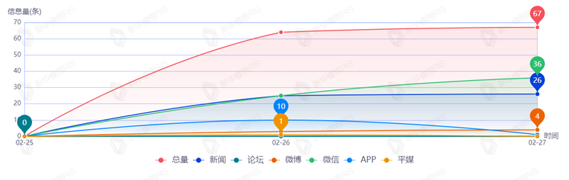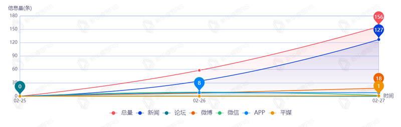 截至2月27日13时30分,该文章在互联网上传播总量为214篇。各信源的信息发布情况中,新闻信息占比最大,其次是微博和APP,信息量分别为161、25、16,占比分别为75.23%、11.68%、7.48%。(数据来源:新华睿思数据云图分析平台)
