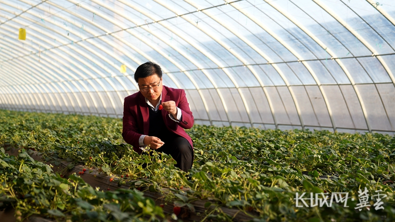 司跃腾在查看草莓生长情况。长城网·冀云客户端记者张超 摄