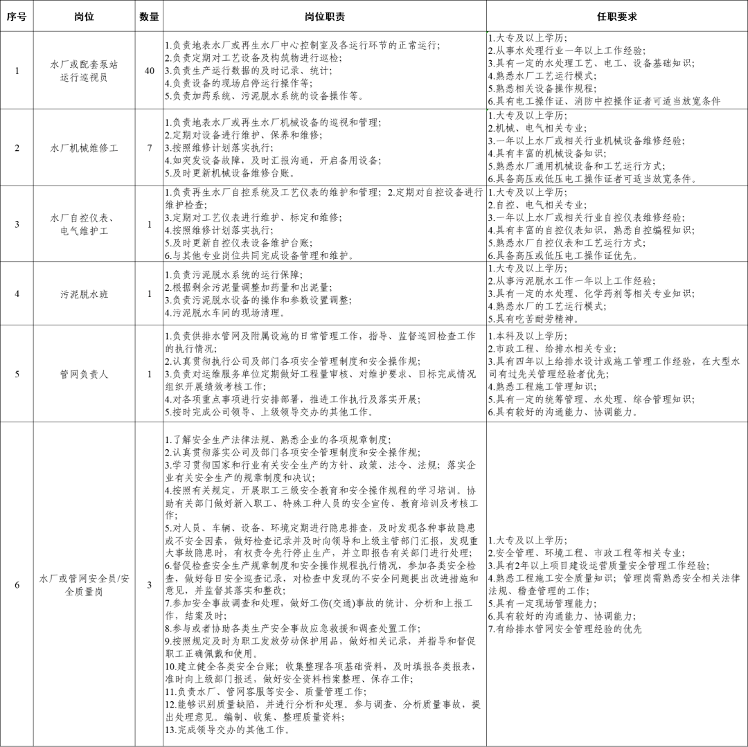 以下岗位入职人员将根据实际工作需要,安排至容东、容西、雄东、昝岗等片区水务运营项目工作。
