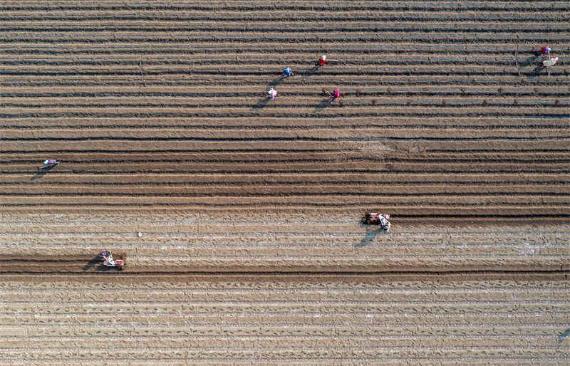 随着天气渐暖,河北唐山丰南区农民抢抓农时播种马铃薯、棉花、辣椒等作物,田间地头呈现出一派繁忙景象。
