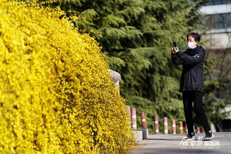 近日,随着气温逐渐回升,石家庄长安公园的一簇簇迎春花正在悄然绽放,呈现出春日的勃勃生机。唱歌跳舞,放松心情……石家庄市民走出家门,拍照、游玩,享受春日暖阳,感受生活美好。