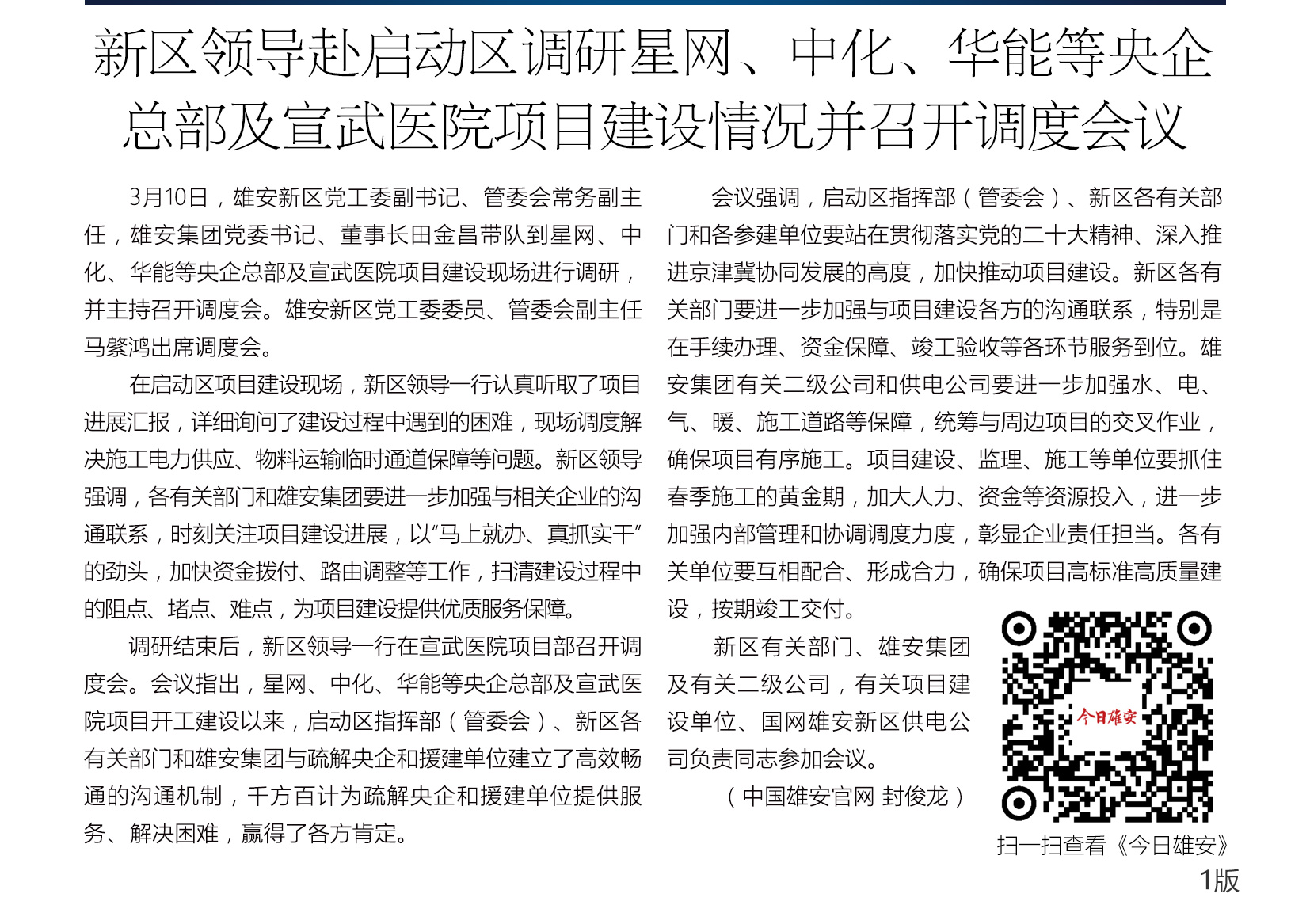 新区领导赴启动区调研星网、中化、华能等央企总部及宣武医院项目建设情况并召开调度会议