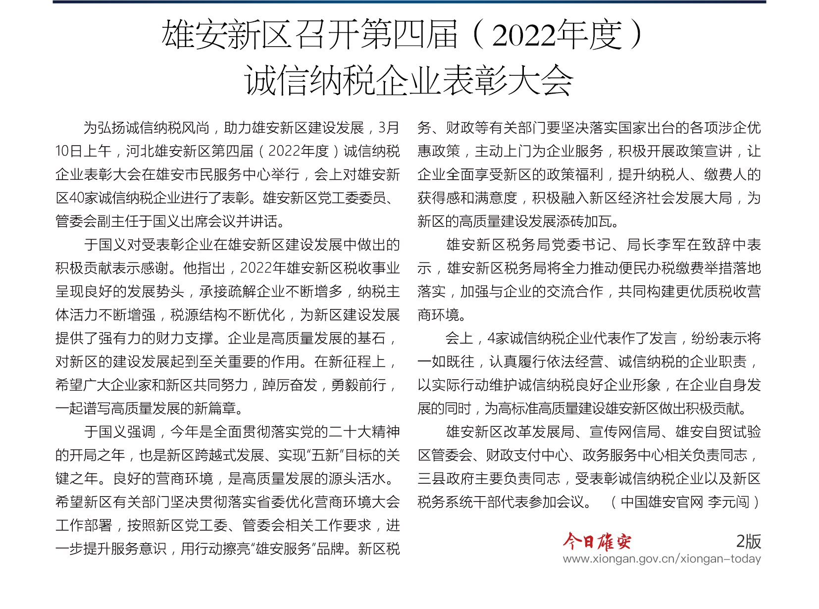 树诚信建新城 “展五新”创未来!雄安新区召开第四届(2022年度)诚信纳税企业表彰大会