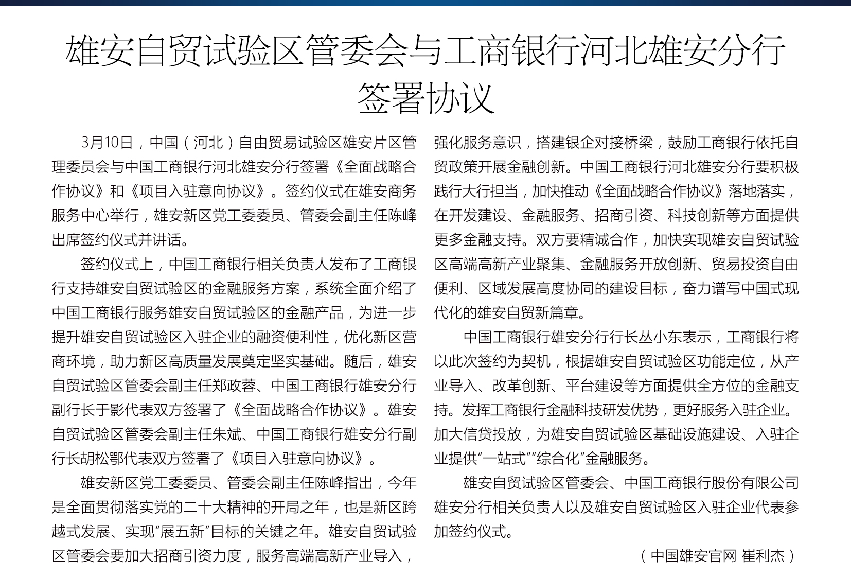 签约!雄安自贸试验区管委会与工商银行河北雄安分行签署协议