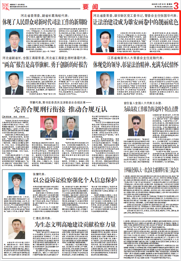 3月10日出版的《检察日报》刊发了题为《河北省委常委,雄安新区党工委书记、管委会主任张国华代表: 让法治建设成为雄安画卷中的靓丽底色 》的报道,一起来看↓↓↓