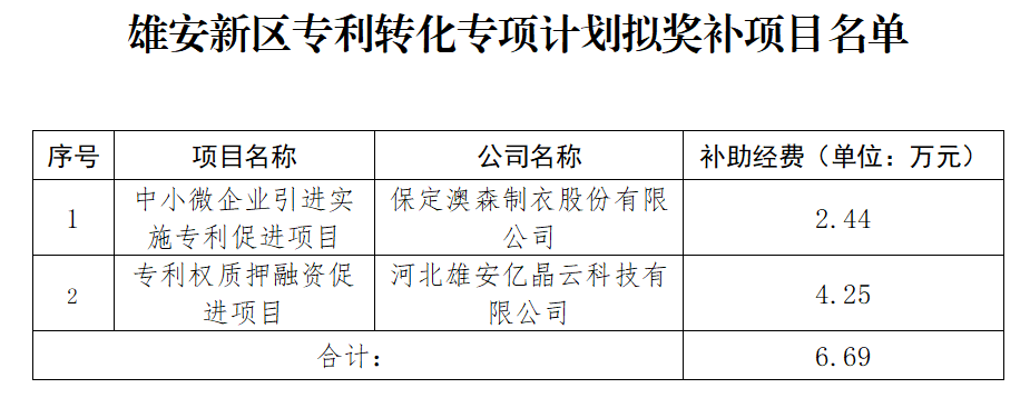 根据《雄安新区专利转化专项计划资金管理办法(试行)》(雄安执法发11号)、《2022年度雄安新区专利转化专项计划实施项目申报指南》等文件的有关要求,雄安新区专利转化专项计划2022年度申报项目已完成专家评审等程序。现将上述项目名称、单位等向社会公示,若无异议后进行奖补;如有异议,请在公示之日起5个工作日(3月20日至3月24日)内提出书面意见,并注明真实姓名、工作单位和联系电话,否则不予受理。