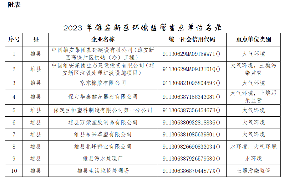 按照《企业事业单位名录信息公开办法》有关规定,现将《2023年雄安新区环境监管重点单位名录》予以公布,详见附件。