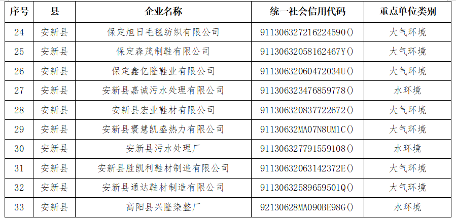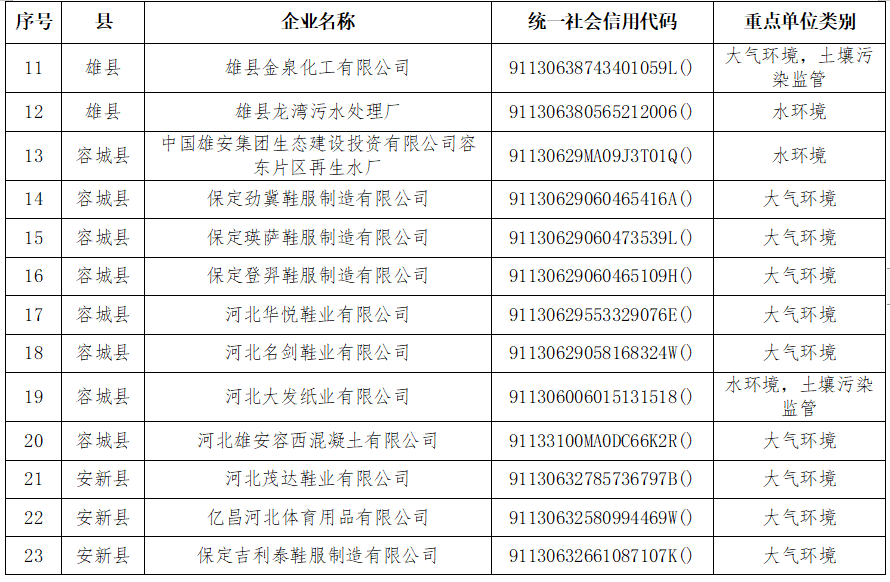 按照省生态环境厅关于环境监管重点单位名录调整的有关要求,雄安新区生态环境局会同三县,认真组织开展名录调整工作。经梳理,确定2023年度环境监管重点单位33家。按属地划分:雄县12家,容城县8家,安新县13家。