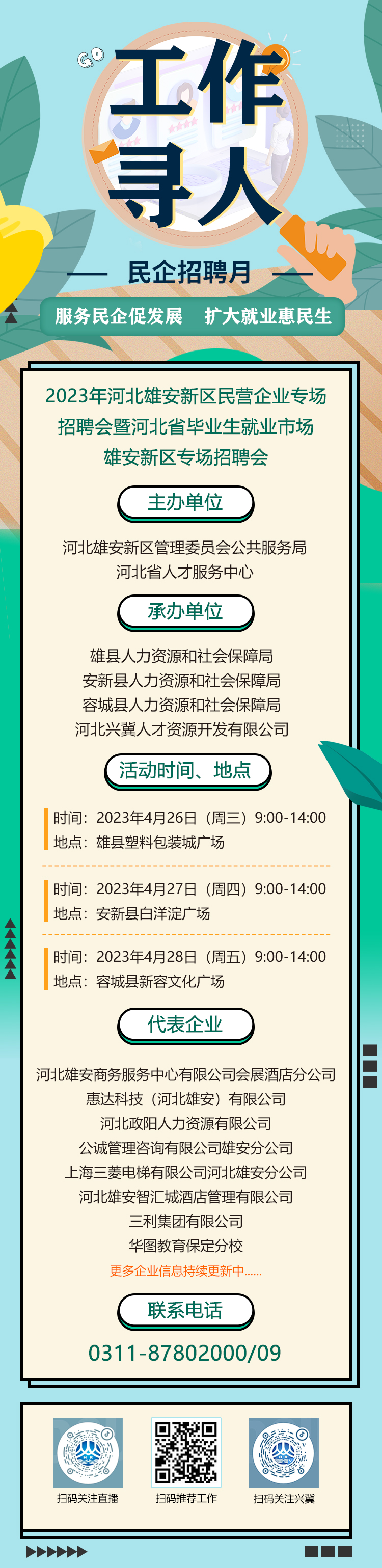 中国雄安官网4月15日电 4月26日-28日,“2023年河北雄安新区民营企业专场招聘会暨河北省毕业生就业市场雄安新区专场招聘会”将举办。活动以“服务民企促发展 扩大就业惠民生”为主题,以新区高校毕业生、退役军人、脱贫劳动力、登记失业人员、农民工、回迁安置群众及社会各界优秀人才为重点对象;广泛发动在新区注册成立的民营企业、中小微企业、个体工商户等各类民营企业参会,充分发挥民营企业吸纳就业主渠道作用,帮助重点群体就业。