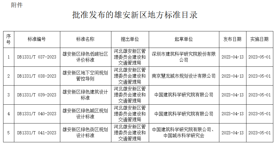 河北雄安新区管理委员会改革发展局会同河北雄安新区管理委员会建设和交通管理局联合发布了《雄安新区绿色低碳社区评价标准》等五项雄安新区地方标准,现予以通告(详细目录见附件)。