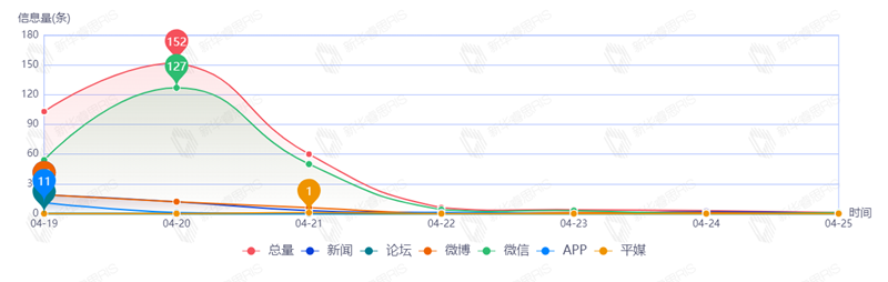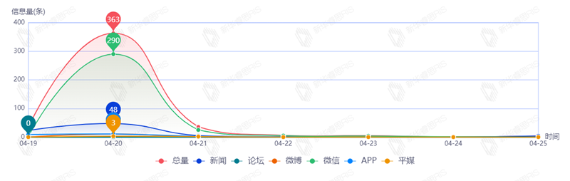 自4月19日首发至4月25日一周内,该文章在互联网上传播总量为329篇。其中4月20日是信息发布的高峰期,发布信息量为152篇文章。各信源的信息发布情况中,微信信息占比最大,其次是微博和新闻,信息量分别为239、39、37,占比分别为72.64%、11.85%、11.25%。(数据来源:新华睿思数据云图分析平台)
