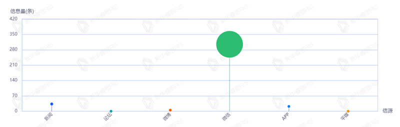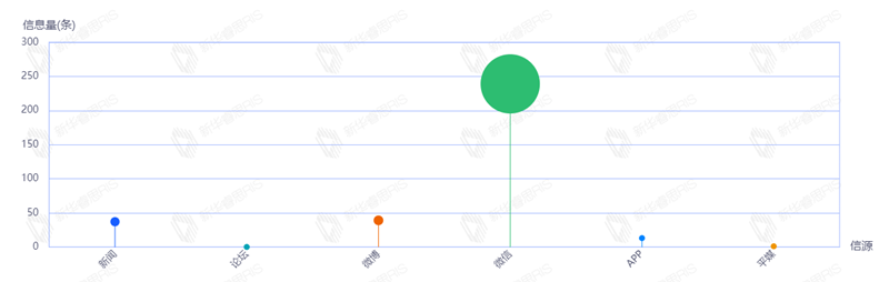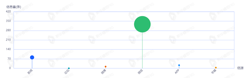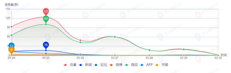 自3月24日首发至3月30日一周内,该文章在互联网上传播总量为365篇。其中3月25日是信息发布的高峰期,发布信息量为125篇文章。各信源的信息发布情况中,微信信息占比最大,其次是新闻和APP,信息量分别为305、33、22,占比分别为83.56%、9.04%、6.03%。(数据来源:新华睿思数据云图分析平台)