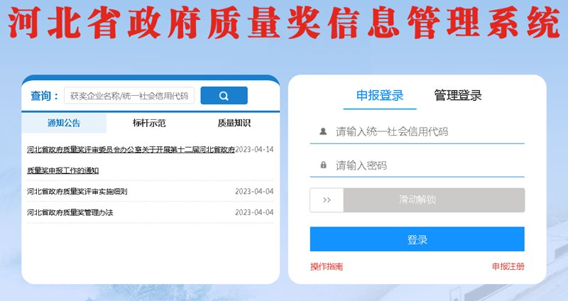 申报组织和申报个人、审核单位、推荐单位请登录河北省政府质量奖信息管理系统。(网址:http://110.249.139.99:8079/qylogin/Login.aspx)