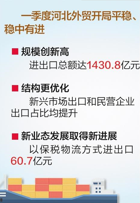 王玉兰介绍,总体来看,一季度河北外贸开局平稳、稳中有进,呈现三个特点。一是规模创新高,进出口总额达1430.8亿元。二是结构更优化,新兴市场出口和民营企业出口占比均提升。三是外贸新业态发展取得新进展,以保税物流方式进出口60.7亿元,同比增长12.3%。