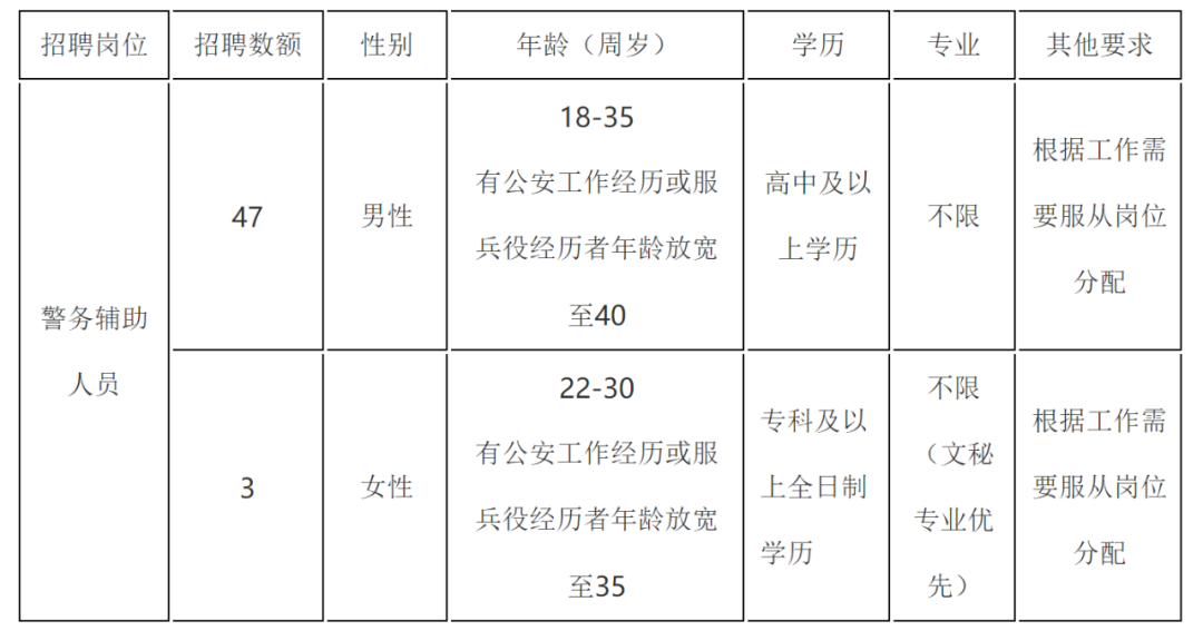 为满足我县公安机关用人需要,保障社会治安秩序稳定,决定以劳务派遣方式招聘警务辅助人员50名,为保证公开招聘工作顺利实施,现公告如下:
