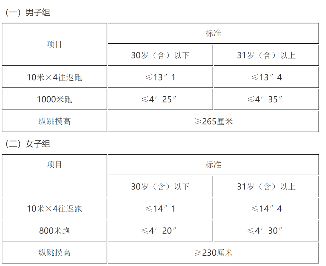 体能测试项目为:①纵跳摸高②10米×4往返跑③男子1000米跑;女子800米跑。标准参照《公安机关录用人民警察体能测评项目和标准》执行。如下: