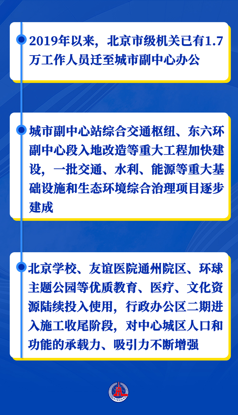 “大城市病”等突出问题得到缓解。控增量、疏存量,北京发布并持续更新新增产业禁限目录,2014年以来,累计不予办理新设立或变更登记业务超过2.4万件,疏解一般制造业企业约3000家、疏解提升区域性批发市场和物流中心近1000个,2020年全市常住人口为2189.3万人,实现了《京津冀协同发展规划纲要》明确的2020年控制在2300万人以内的目标,2022年为2184.3万人。