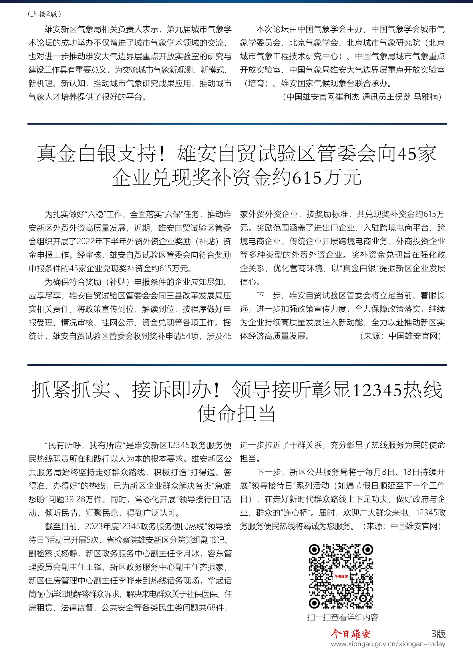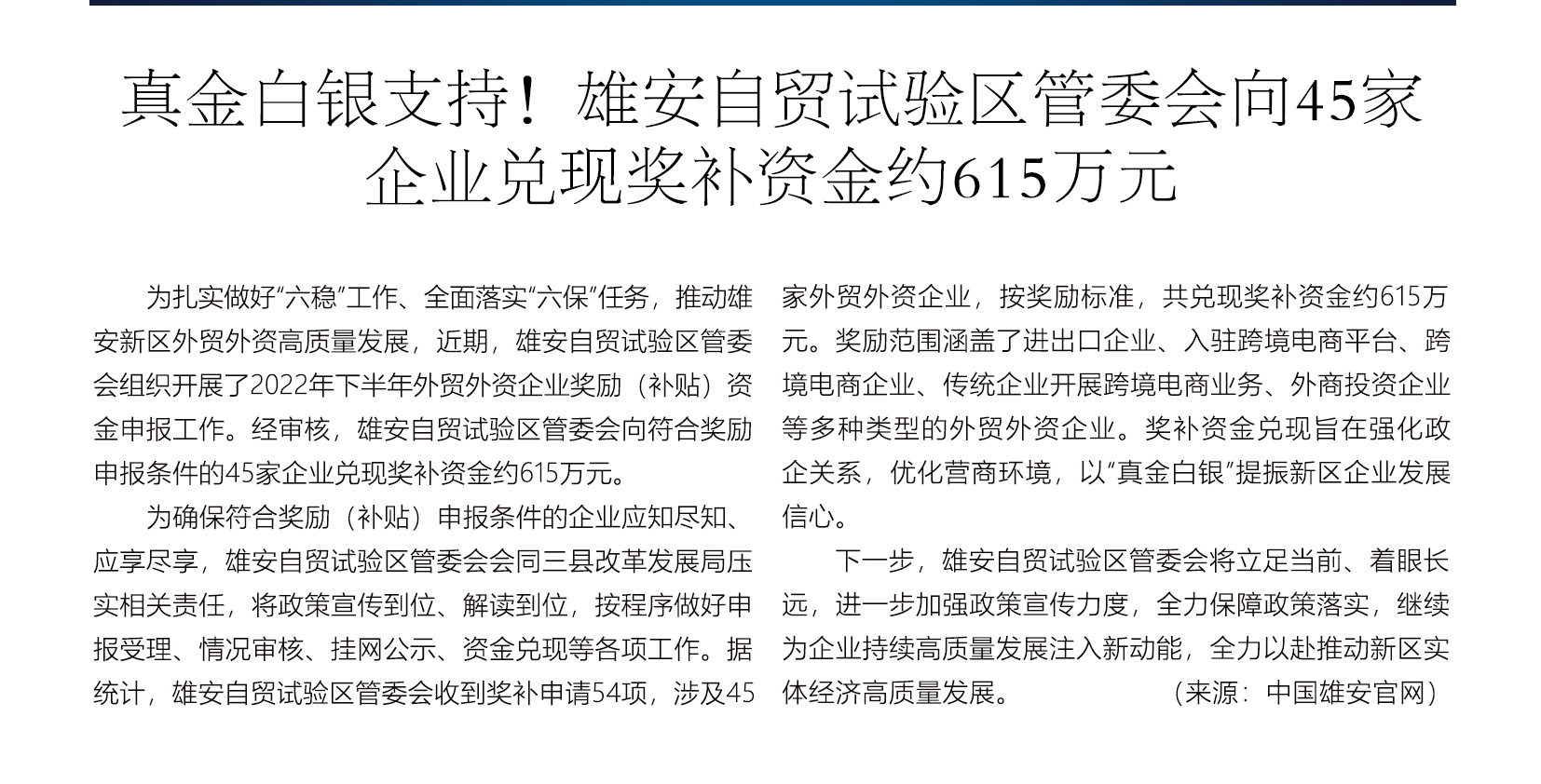 【雄安之声】雄安自贸试验区管委会向45家企业兑现奖补资金约615万元