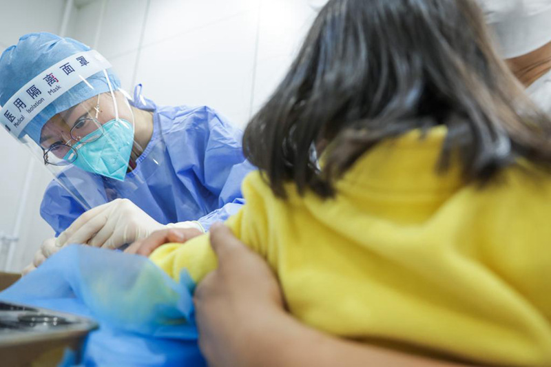 5月9日22时许,北京协和医院急诊科发热门诊护士姜迪为一个儿童采指血。新华社记者张玉薇 摄