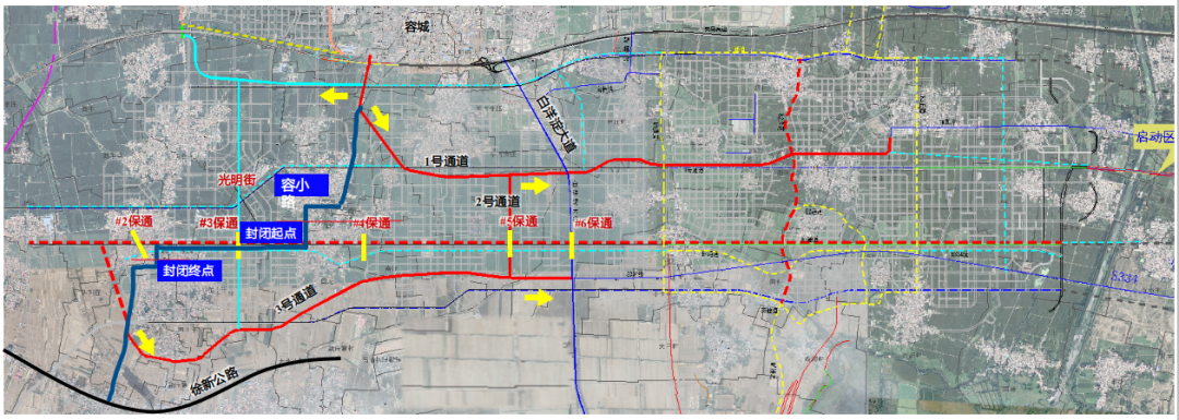 二、施工区域内布置南北保通通道,社会车辆及行人可绕行光明街、1号通道、2号通道、3号通道等周边道路。