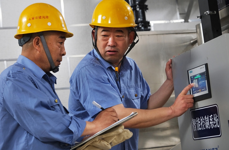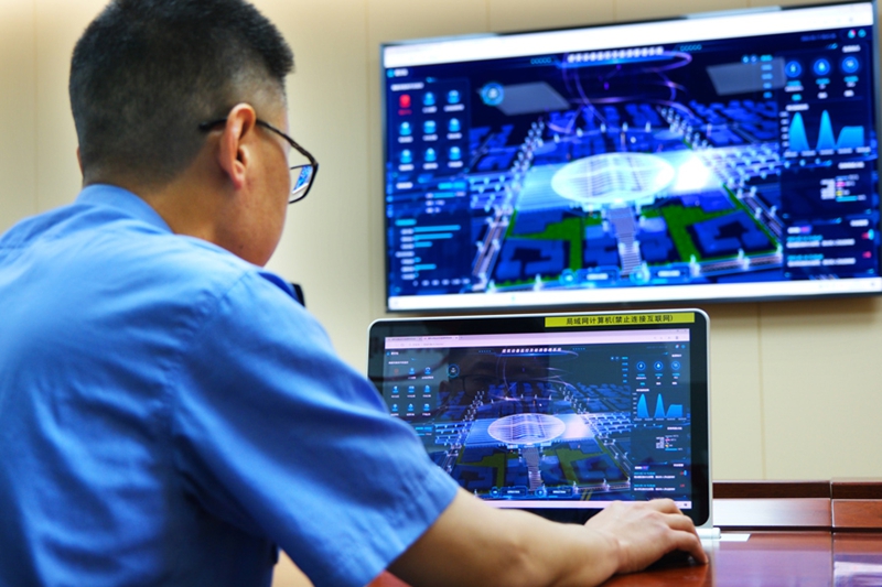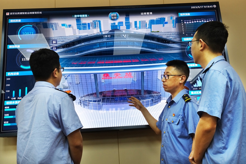 5月17日,中国铁路北京局集团有限公司石家庄房建公寓段雄安站“智能+”工作室工作人员正在通过智能运维管理系统分析设备状况。(杨宝森 摄)