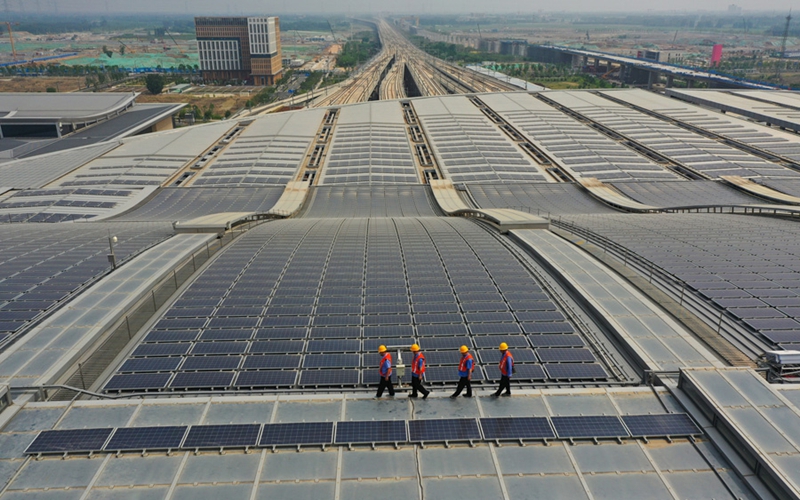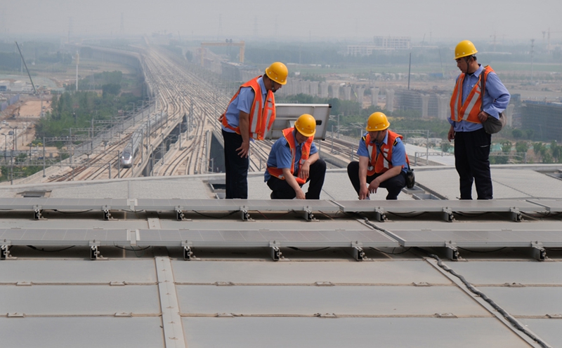 5月17日,“智能+”工作室工作人员在雄安站站房顶部对光伏发电设备进行巡视检查。(杨宝森 摄)