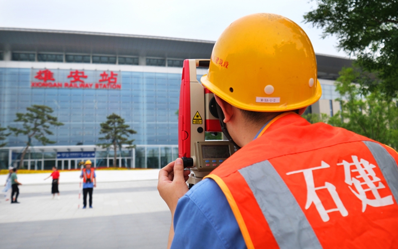 5月17日,“智能+”工作室工作人员在雄安站外进行沉降观测作业。(杨宝森 摄)