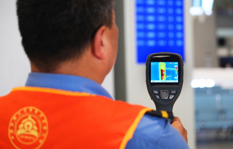 5月17日,“智能+”工作室工作人员在雄安站候车大厅内利用热成像仪对通风设备进行检测。(杨宝森 摄)