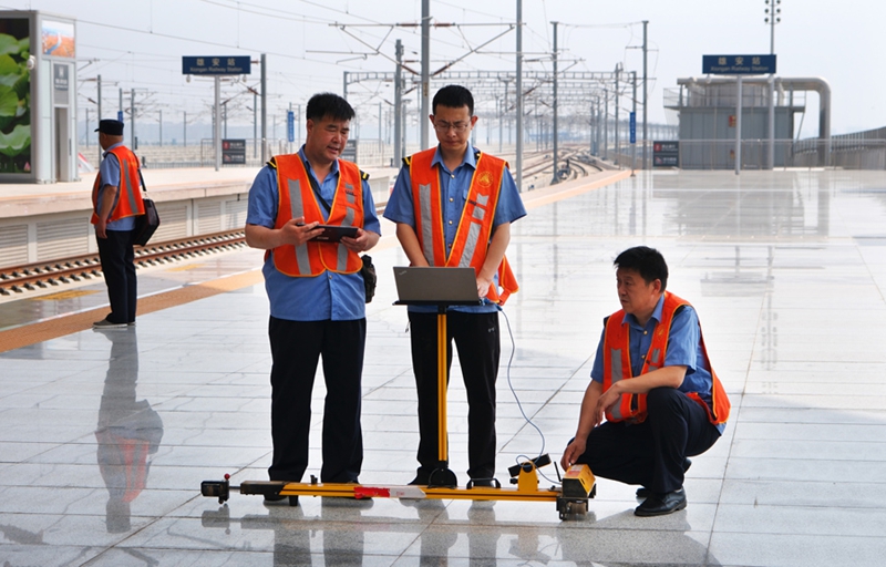 5月17日,“智能+”工作室工作人员在雄安站站台调试站台限界测量机器人。(杨宝森 摄)