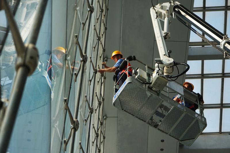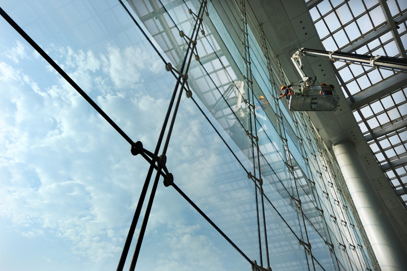 5月17日,“智能+”工作室工作人员在雄安站进站大厅对幕墙玻璃进行高空维护检查。(杨宝森 摄)