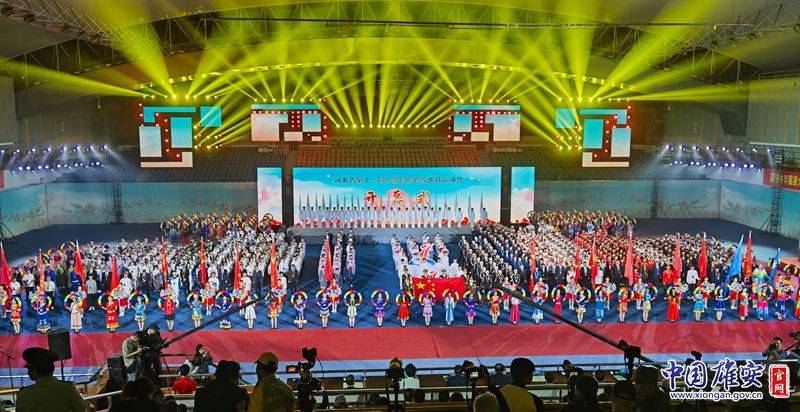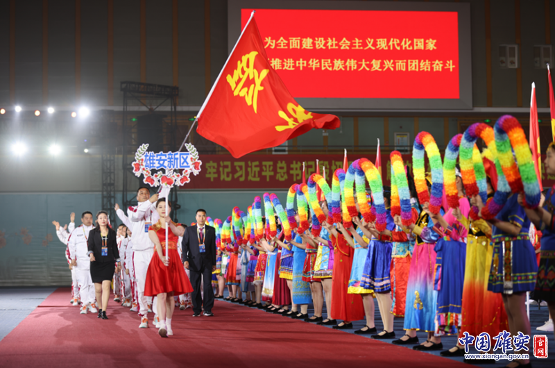 河北省第十一届少数民族传统体育运动会开幕式文艺演出现场,雄安代表团正阔步走来。中国雄安官网发