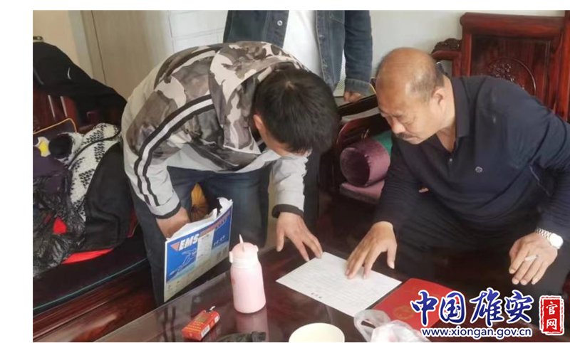 邮递员在群众家中指导不动产权利人填写《领证单》。雄安新区自然资源和规划局供图