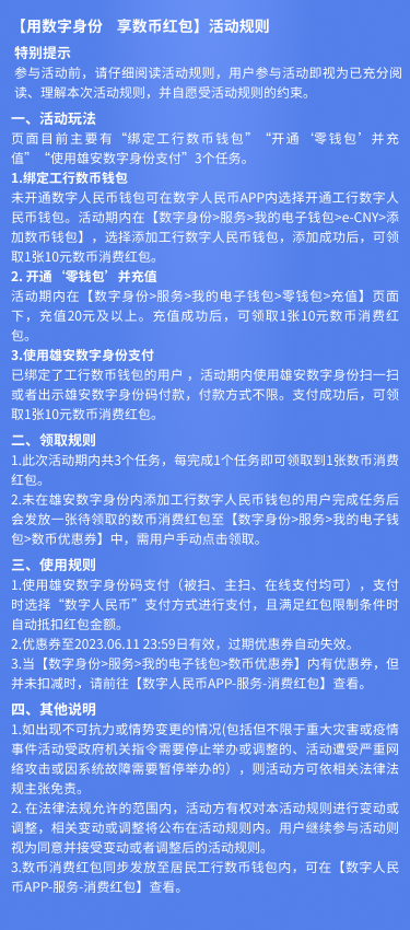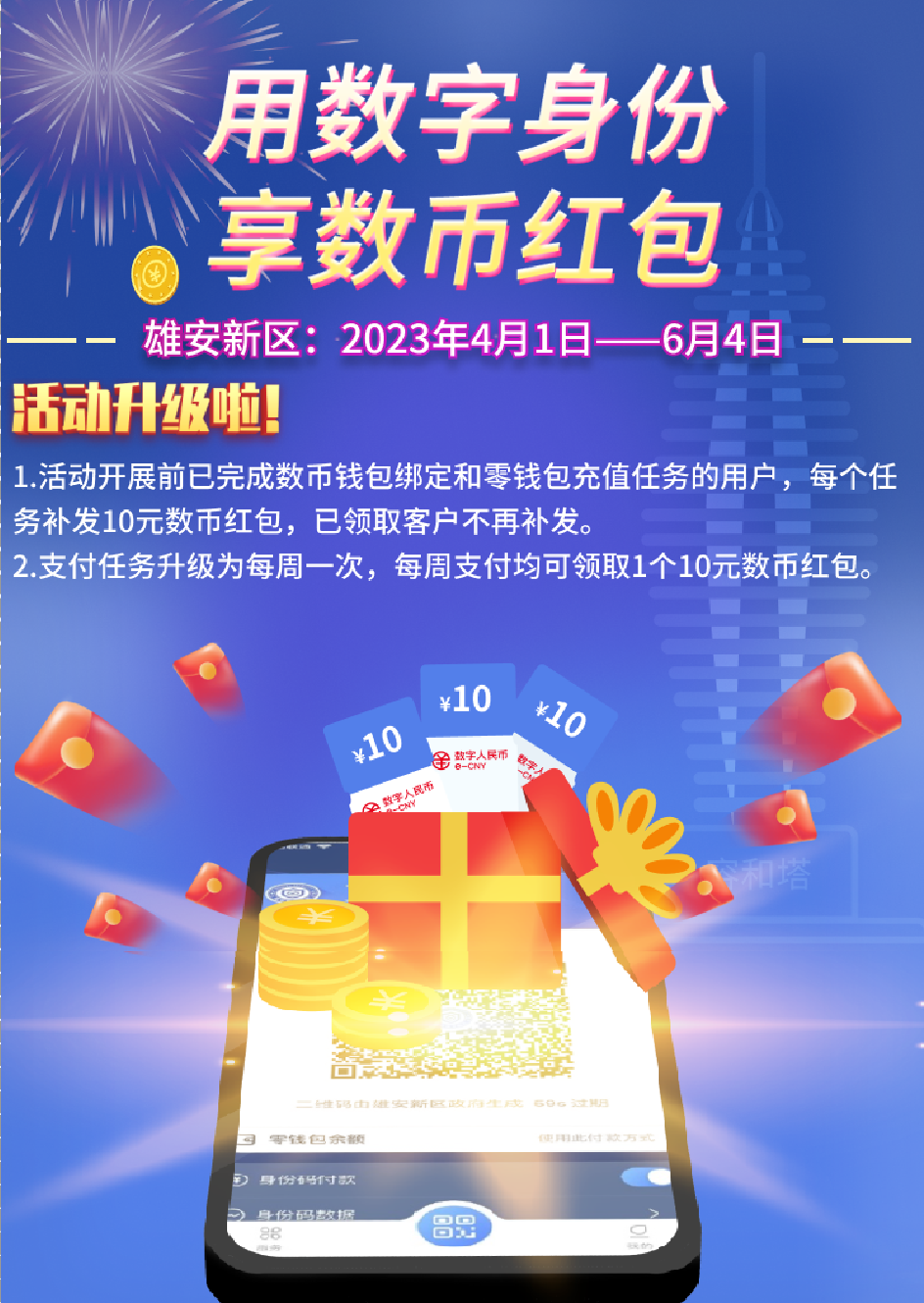“用数字身份 享数币红包”活动全面升级,不仅活动范围扩大至雄安新区容东片区,红包福利也同步升级,每周完成支付任务均可领取红包,大家赶快行动起来吧!