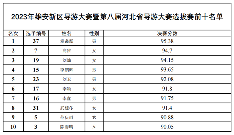 2023年雄安新区导游大赛暨第八届河北省导游大赛选拔赛决赛成绩公示。