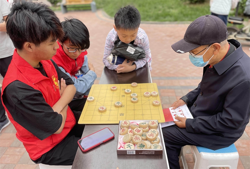 志愿者们摆放棋盘,邀请来往老人下棋交流