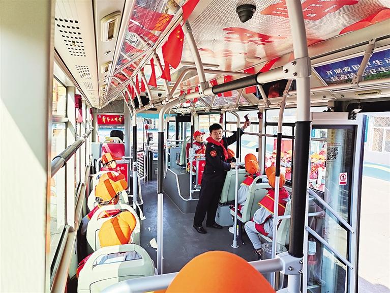 公交集团开展“小手拉大手 共创文明城”活动。图为车长为小学生讲解公交安全知识。